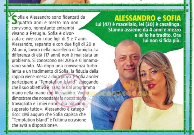 Casalinga di professione, la 30enne ha un matrimonio finito alle spalle. Sofia e alessandro sono una coppia di non famosi che fanno parte del cast di temptation island: I due stanno insieme da quattro anni. Erano usciti insieme li ritroviamo un mese dopo, durante l'ultima puntata, da soli. Ancora non hanno fatto il passo verso una convivenza, nonostante vivano nella stessa città.